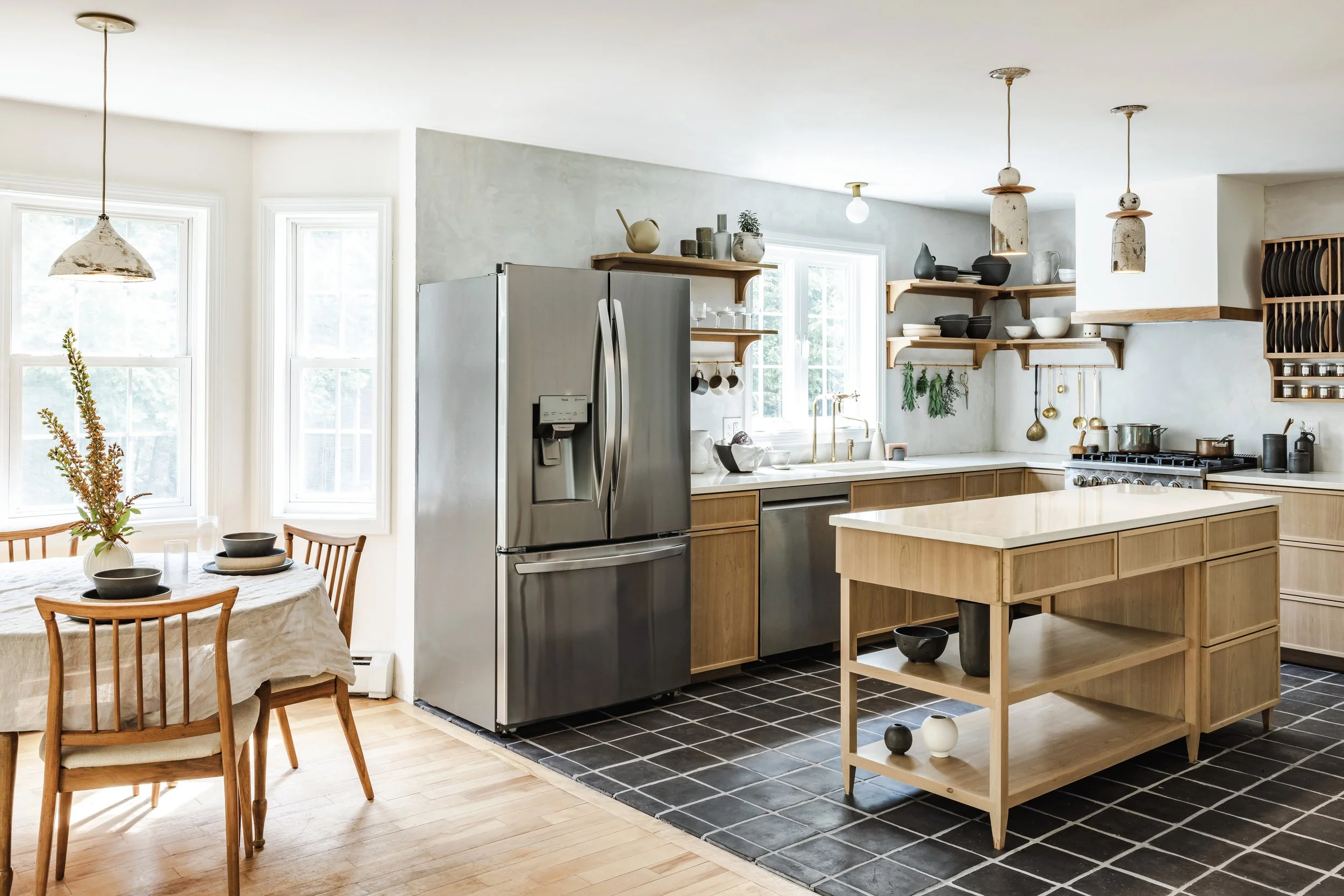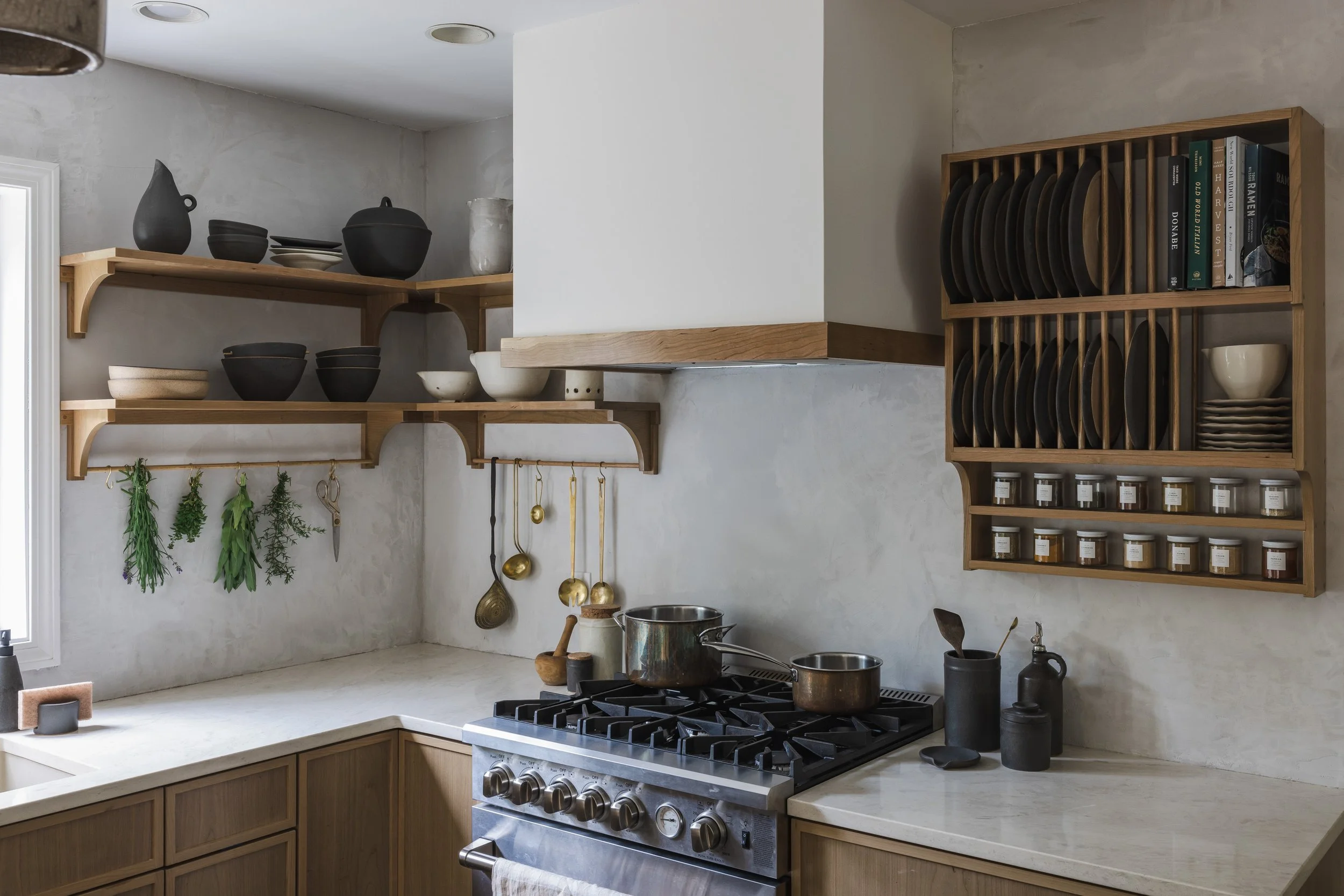 We started talking with Tate, who built our base cabinets at the end of February and we just completed it in mid-July. Joe and I have been dreaming of designing this kitchen together for a long time. For years I've been gathering photos of different kitchens and inspirations. Tate did an amazing job bringing our vision to life with the base cabinets, his craftsmanship was really so impressive. He created a beautiful thin trim around the cabinets for a modern look. Joe then used the same type of wood and stain to create the open shelving and the spice rack, and I love the way he built the hood vent with the same trim detail to imitate the base cabinets. Joe then did a plaster technique on the walls of the kitchen, using plaster and a combination of pigments to create a warm gray tone. We learned this method from Tara & Percy, owners of Jersey Ice Cream Co., an interior design business. They teach workshops on plastering at home! Joe laid the floor tiles from Cle Tile and installed our beautiful Raku & Maple Pendants over the kitchen island. This kitchen was very much a labor of love and a collaborative effort with so much thought and detail put into it. We have more plans to hand-make a tile backsplash behind the stove, but for now, it's finished! We are in love with the final result and finally feel like our home is starting to feel like it's our own!