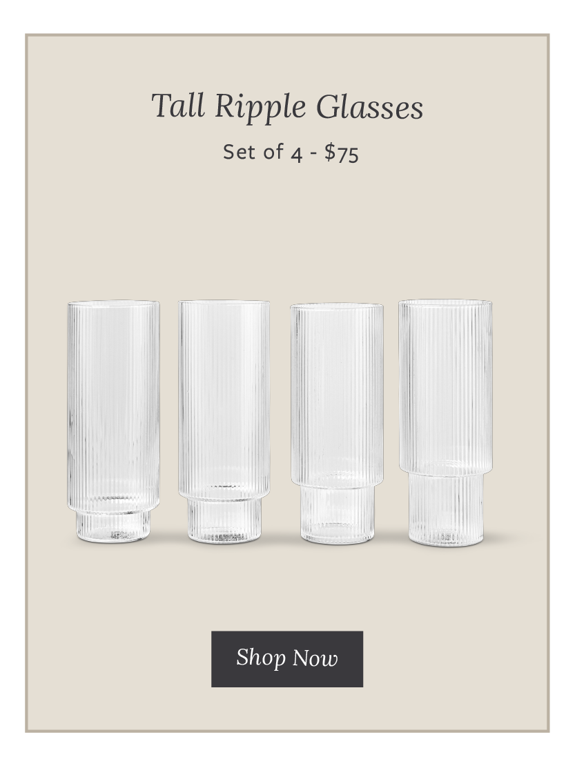 Add a touch of softness with linen napkins, gently placed in our forage napkin rings with a sprig of dried florals for a simple but elegant touch. Set the table with our ripple glassware for some sparkling water and add in the champagne saucers for a little holiday bubbly.